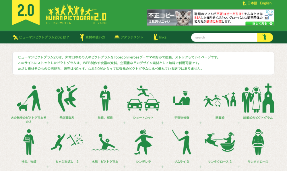 誰にでもなじみのある「非常口の人」が、さまざまなシーンに沿ったイラストとなって提供されているサイトです。