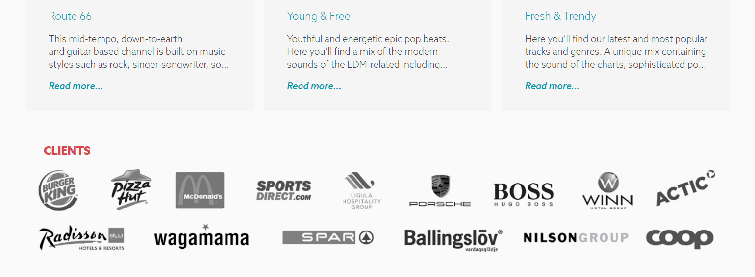 Epidemic Sound(エピデミックサウンド)は、大手企業と多数取り引きしており、クライアントリストが掲載されています。